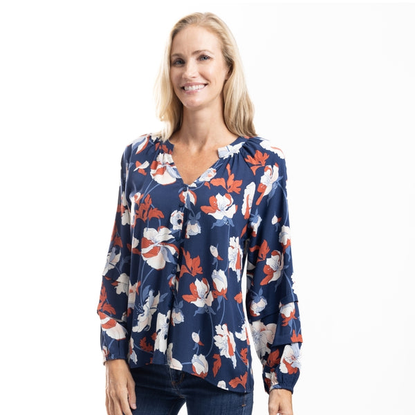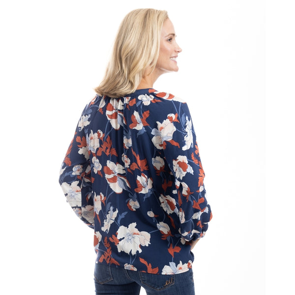 Step into effortless elegance with the Meadow Bloom Navy Floral Peasant Blouse. This beautifully crafted blouse features a delicate floral design in shades of burnt orange, light blue, and ivory, set against a rich navy background. Made from 100% rayon, this blouse offers a soft, lightweight drape that feels as good as it looks.
