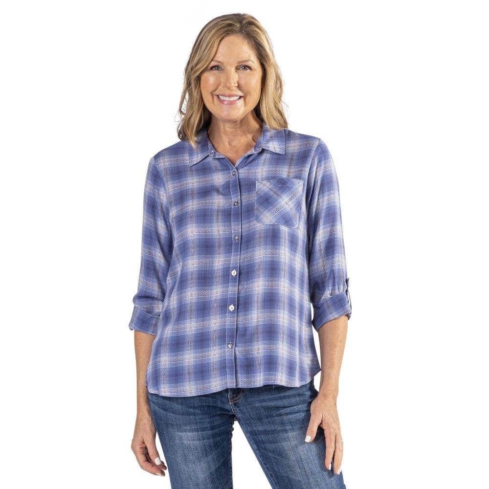 A feminine update to a classic, this flannel button up has a beautiful crochet accent on the back, and lurex threads to add a little pizzaz. Super soft and comfortable with a stylish ease perfect for any season. Adjustable sleeves make it an easy transition piece!