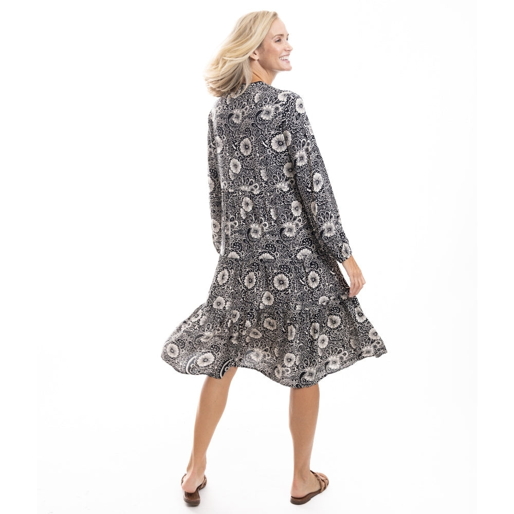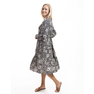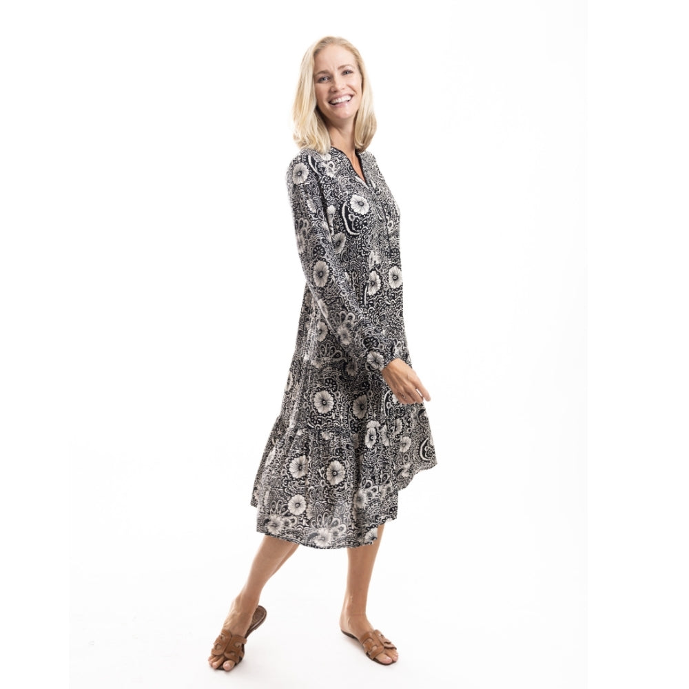 Step into effortless style and comfort with our Women's Black Floral V-Neck Tiered Midi Dress. Crafted from 100% rayon, this dress offers a soft, breathable feel that's perfect for all-day wear. The flattering v-neckline complements the flowing, tiered design, creating a graceful silhouette that moves beautifully with you. The elegant black floral pattern adds a touch of sophistication, making this dress an ideal choice for any occasion.