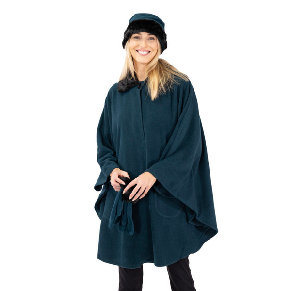 Le Moda Women's Black Fur Collar Polar Fleece Wrap with Matching Gloves and Hat-One Size Fits All at Linda Anderson.  color_teal