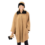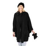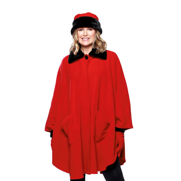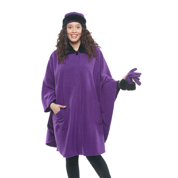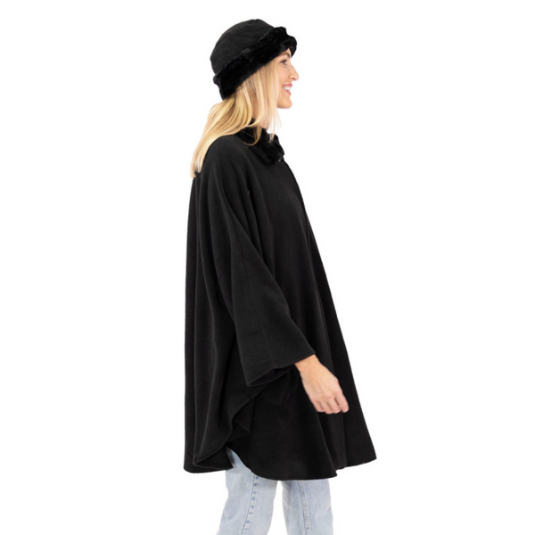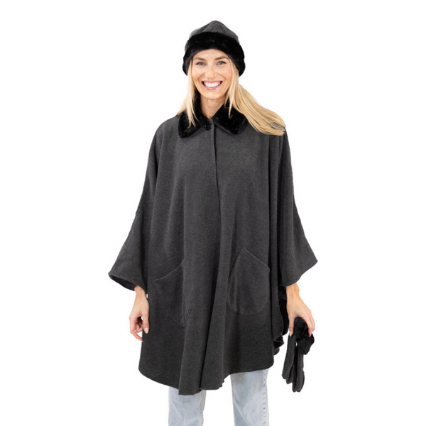 We love Marie and her long coziness!  One of our longest styles, she definitely keeps us cozy while out and about. She frames our face with a cozy faux fur collar that is simple and sweet.  Don't forget your included matching hat and gloves, also adorned with the really fun faux fur trim!  Tacked sleeves to keep this cape style in place with a single button closure at the neck.  Handwarmer patch pockets are the perfect size for your phone or gloves.