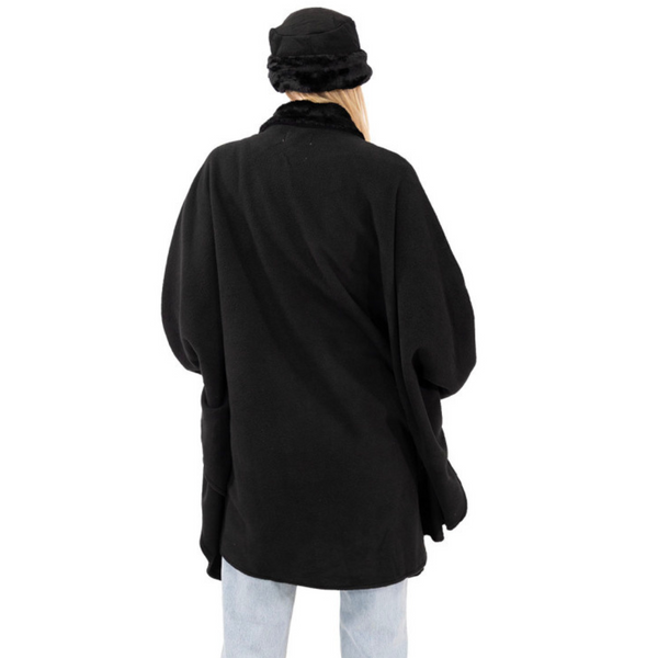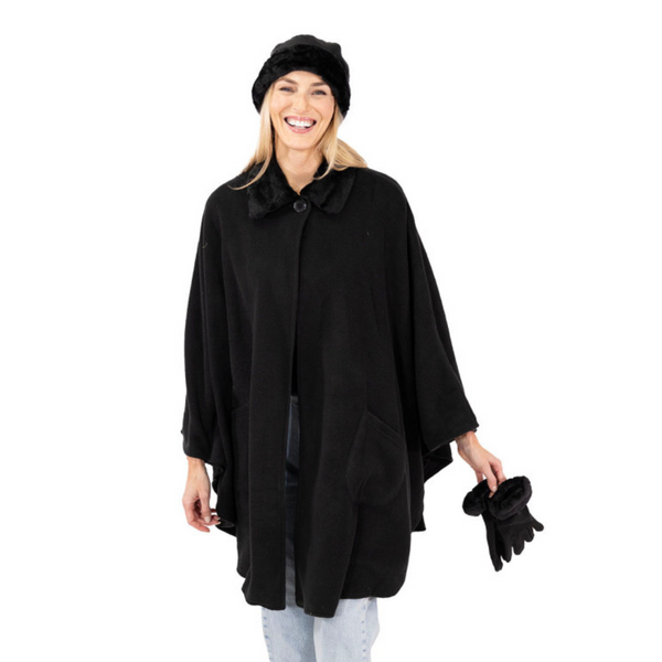 Le Moda Women's Black Fur Collar Polar Fleece Wrap with Matching Gloves and Hat-One Size Fits All at Linda Anderson. color_black