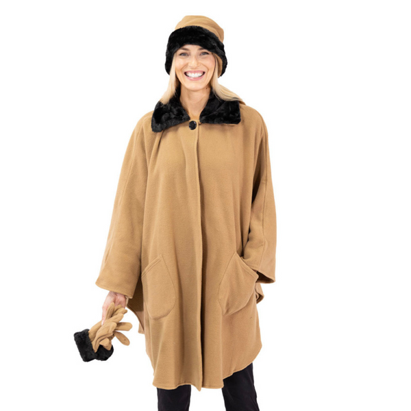Le Moda Women's Black Fur Collar Polar Fleece Wrap with Matching Gloves and Hat-One Size Fits All at Linda Anderson.  color_camel
