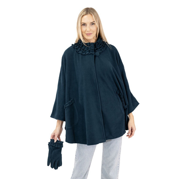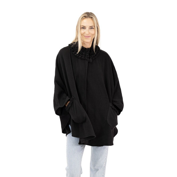 The Shelby Cozy Fleece Cape with a ruffled collar is one of our warmest Cozy Coats yet.  Single button closure sits below the stand up ruffled collar, to keep cold air from coming down your neck. A tacked sleeve keeps your cape in place without restricted movement and accommodating the bulkiest of outfits. Handwarmer patch pockets are placed perfectly and accentuated with a ruffle to store your phone or matching included gloves!  The hat sits perfectly on your head, and the ruffles frame your face beautifully.