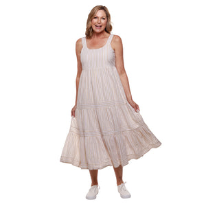 A flowing sundress subtle sandy and white complimentary stripes along with a shimmer of golden lurex are perfect for a warm spring or summer's day at the beach or in the city. The tiers fall comfortably around tea length flowing in the breeze. Paired with a jean jacket, it could be your new daily staple! And with many colors available, you can have one for every day of the week.