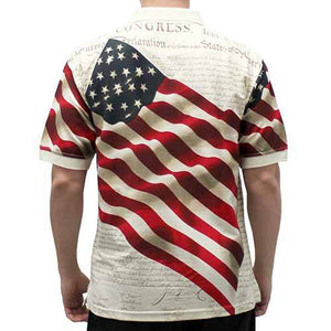 This is a soft hand feel, 100% cotton, rib knit collar and cuffs, side vent styling, classic fit, very comfortable polo... and it doesn't get more patriotic than this! You would be wearing the Declaration of Independence and the American Flag.