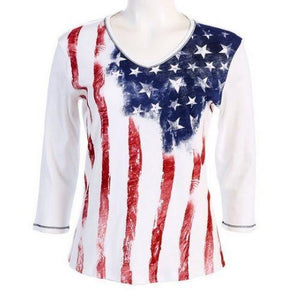 This Old Glory Ladies 3/4 Sleeve Shirt offers style, extreme comfort and patriotism all-in-one! Its USA flag design gives this top a "vintage American" look that goes great with jeans or denim shorts. Perfect to wear for any patriotic event such as the 4th of July, Memorial Day or even as casual wear for every day use.